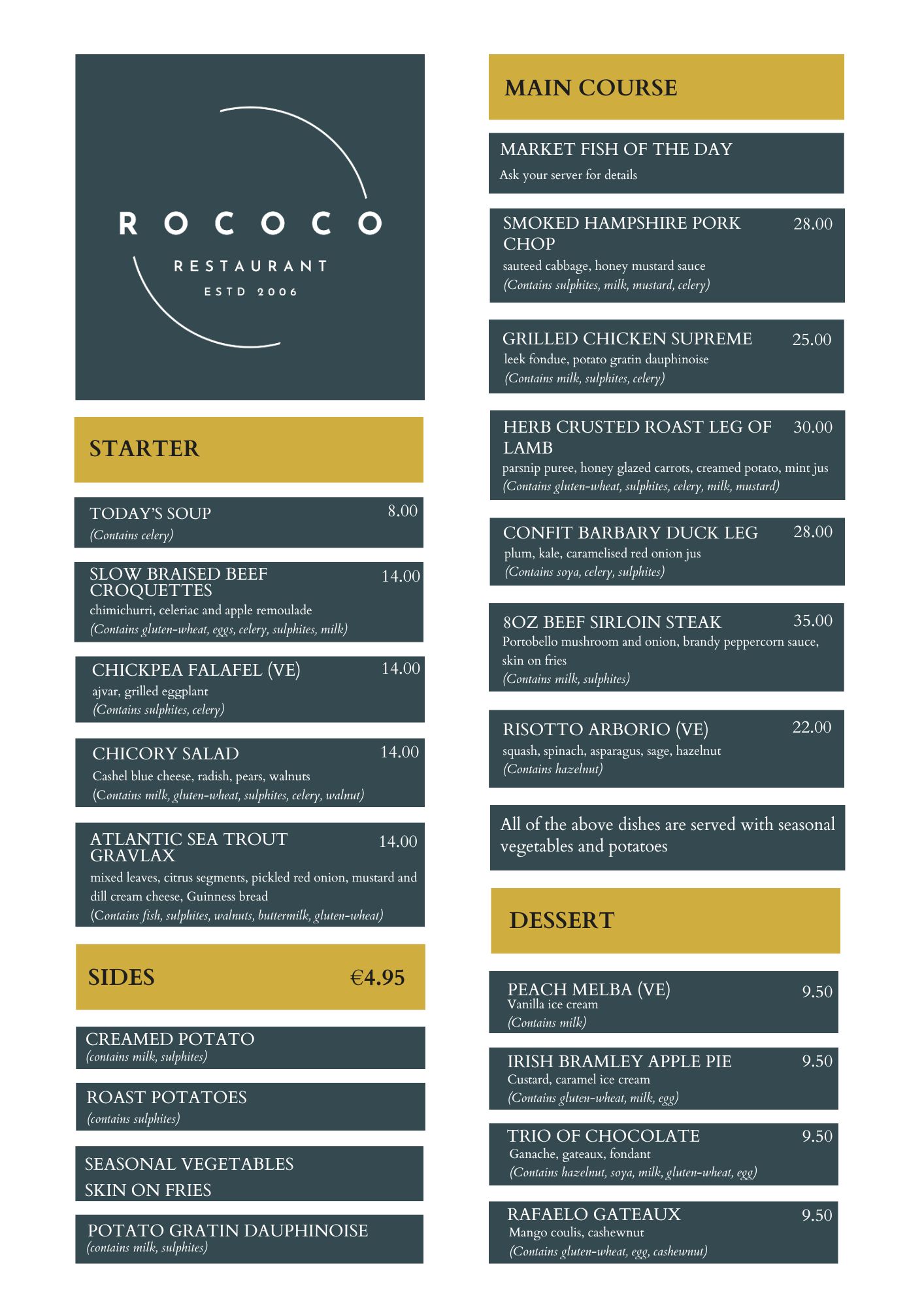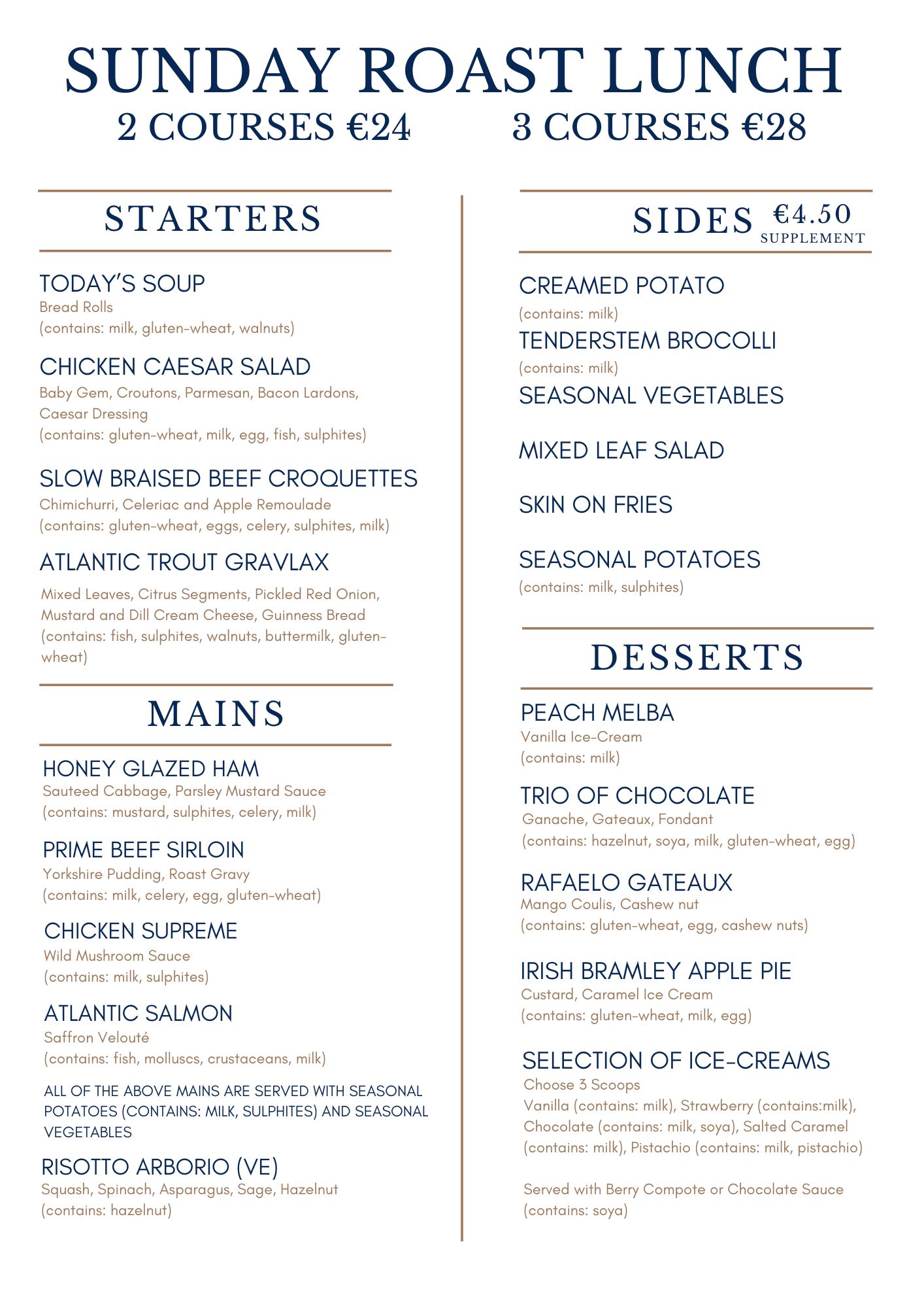 Sample Sunday Roast Lunch Menu