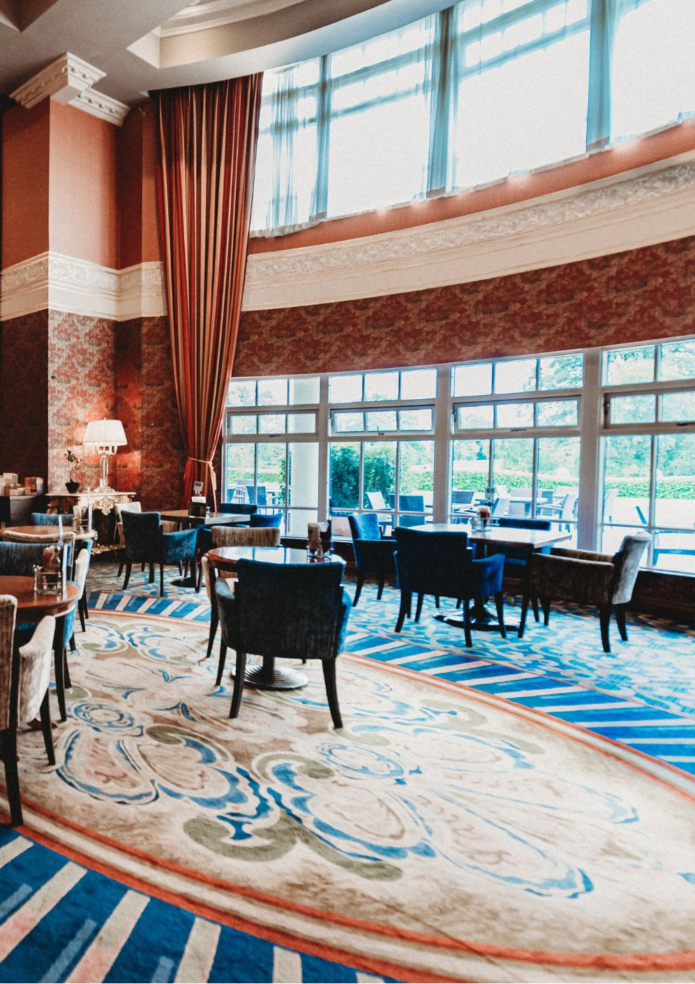 The high ceilings, classic detailing, and abundant daylight create a bright yet intimate atmosphere that transitions beautifully from day to evening.